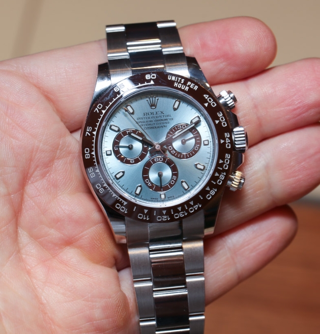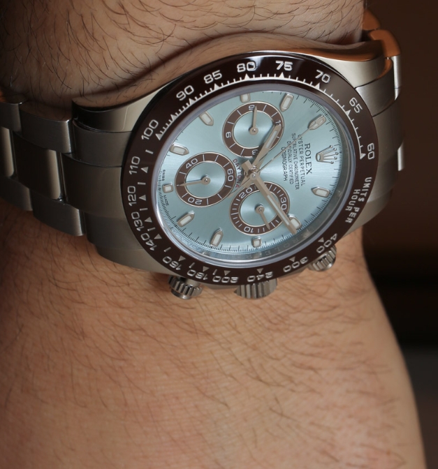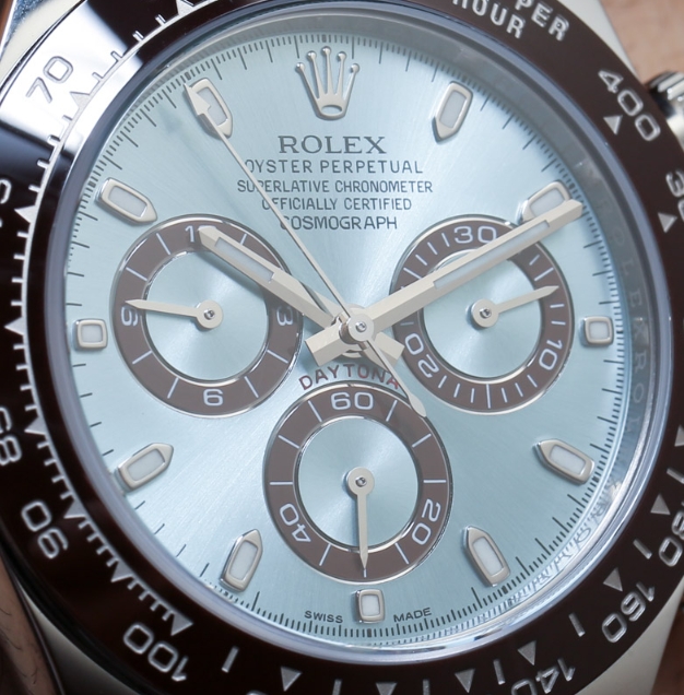 Rolex released the very first Daytona models with a ceramic bezel two years ago. It was a black ceramic bezel, and ironically one of them was matched to a “chocolate” brown dial. But this model has the first ever brown ceramic bezel. It is a deep brown, and in the right light it would look black. The metallic ice blue dial is beautiful, and I agree that from an aesthetic standpoint it matches brown much better than black. Though I bet it would look nice with a blue ceramic bezel. Think of that: platinum case, deep blue bezel and light blue dial. You could even put it on a blue alligator strap. That would look classy…